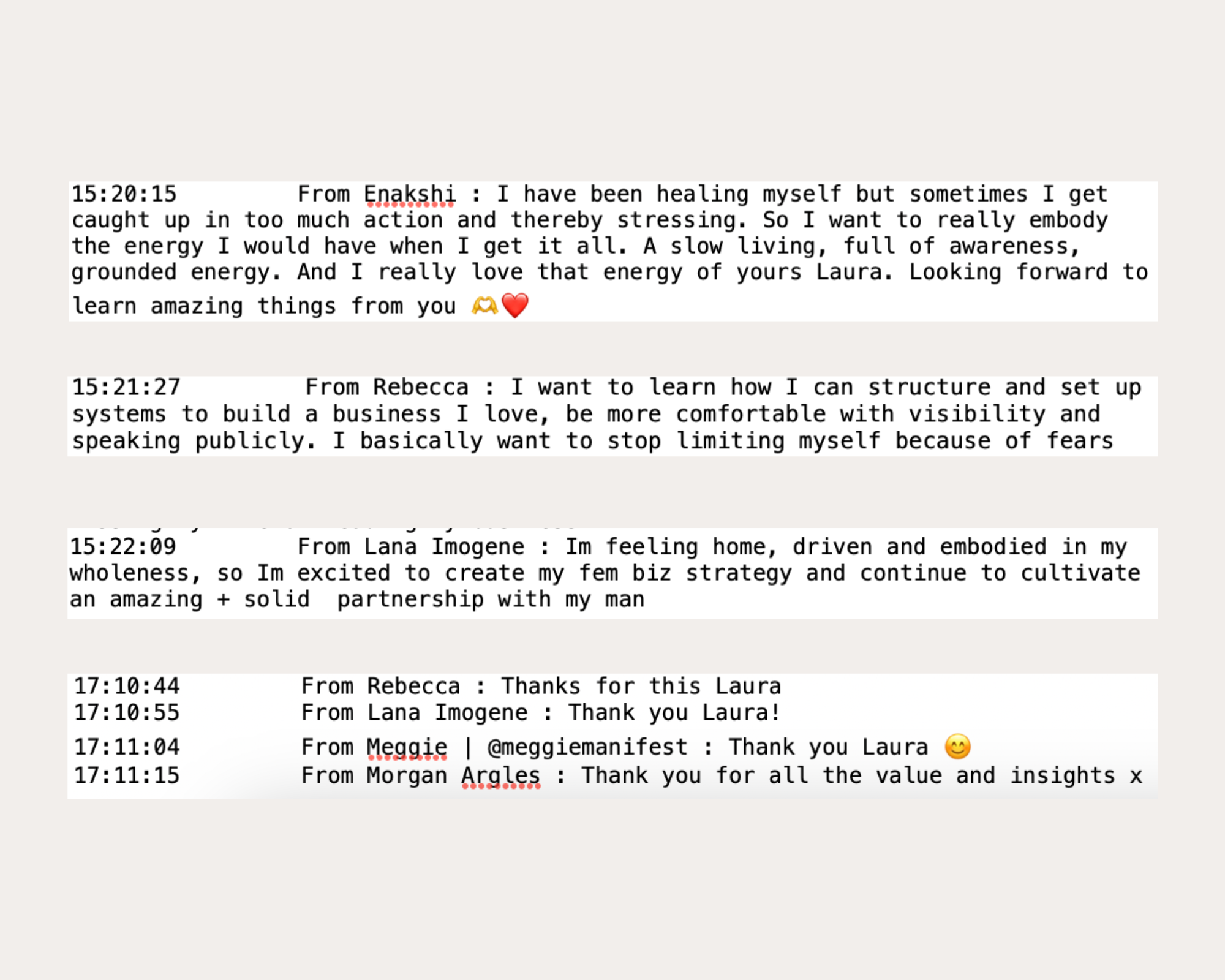 Laura’s impulses on the weekly calls and the questions in the workbook helped me recognise this layer of my personality; on top, communicating with the lovely women in the group helped me to stay accountable and practice my routines which also bring out my confidence daily.