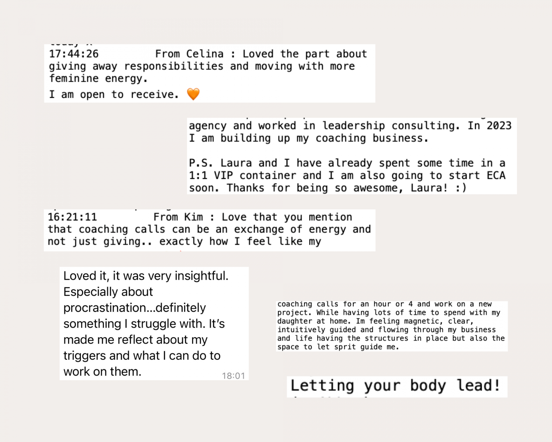 Working with Laura helped me to release a lot of beliefs and patterns that were holding me back. I received a lot of great input to improve my productivity, time and energy management, and overall mental and emotional well-being. A big struggle was my fear of judgment that was sabotaging my efforts to show up authentically on social media. Now, after her coaching, I understand the reasons why I had the fear, but this fear no longer impacts what I do. So, there is more freedom and more confidence now. I loved that she always gave me very necessary feedback for the homework, and the support she provided through WhatsApp. Laura truly offers high-touch support and goes above and beyond for her clients. She is not just like any other coach, but is passionate about her client’s growth - she is like a friend who cares about every aspect of her clients’ lives and well-being.