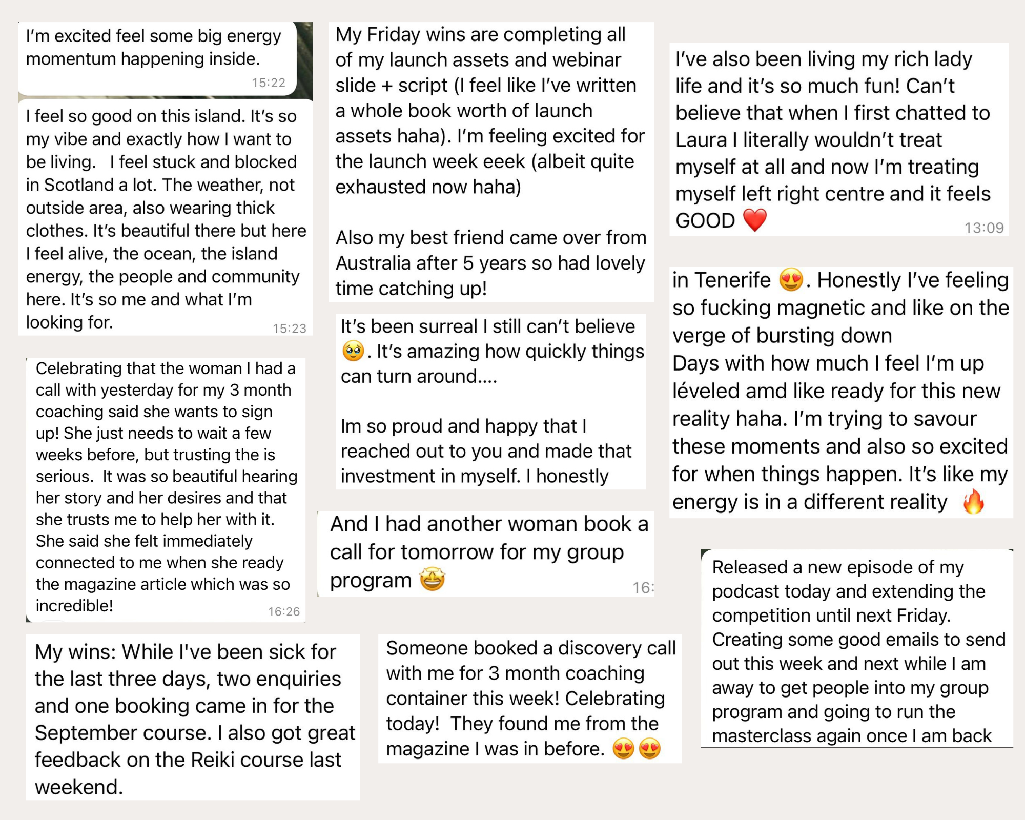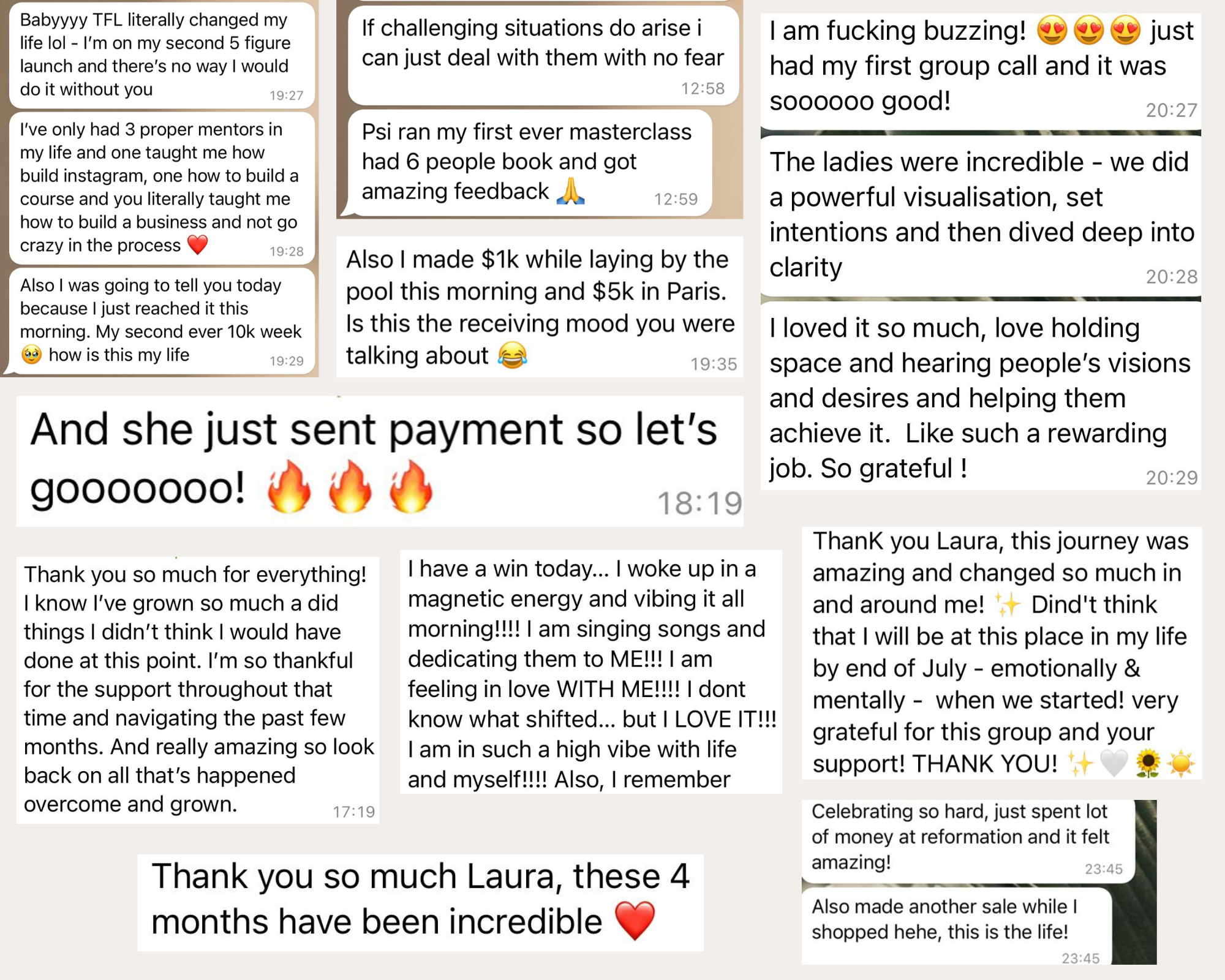 I always felt so supported and cheered on by Laura. It's soo great to have someone who can talk me off the ledge on speed dial! Laura is SUPER hands on and always provides support when needed! I got so much value from the group calls as well as WhatsApp access to Laura outside of the call times. I have been celebrating my first $20k launch during my time inside of TFL! On top, I quit my full time job, improved my relationship with my husband & overall experience a higher quality of life. It was so helpful to take stock of where I was and what needed to improve. Once we identified that, Laura helped me identify needlemovers that got me to the outcome so.much.quicker than I could ever have expected! Laura is genuinely the most hands on and generous coach and mentor I ever came across. She has the perfect balance of no BS business and life advice and powerful spiritual practices