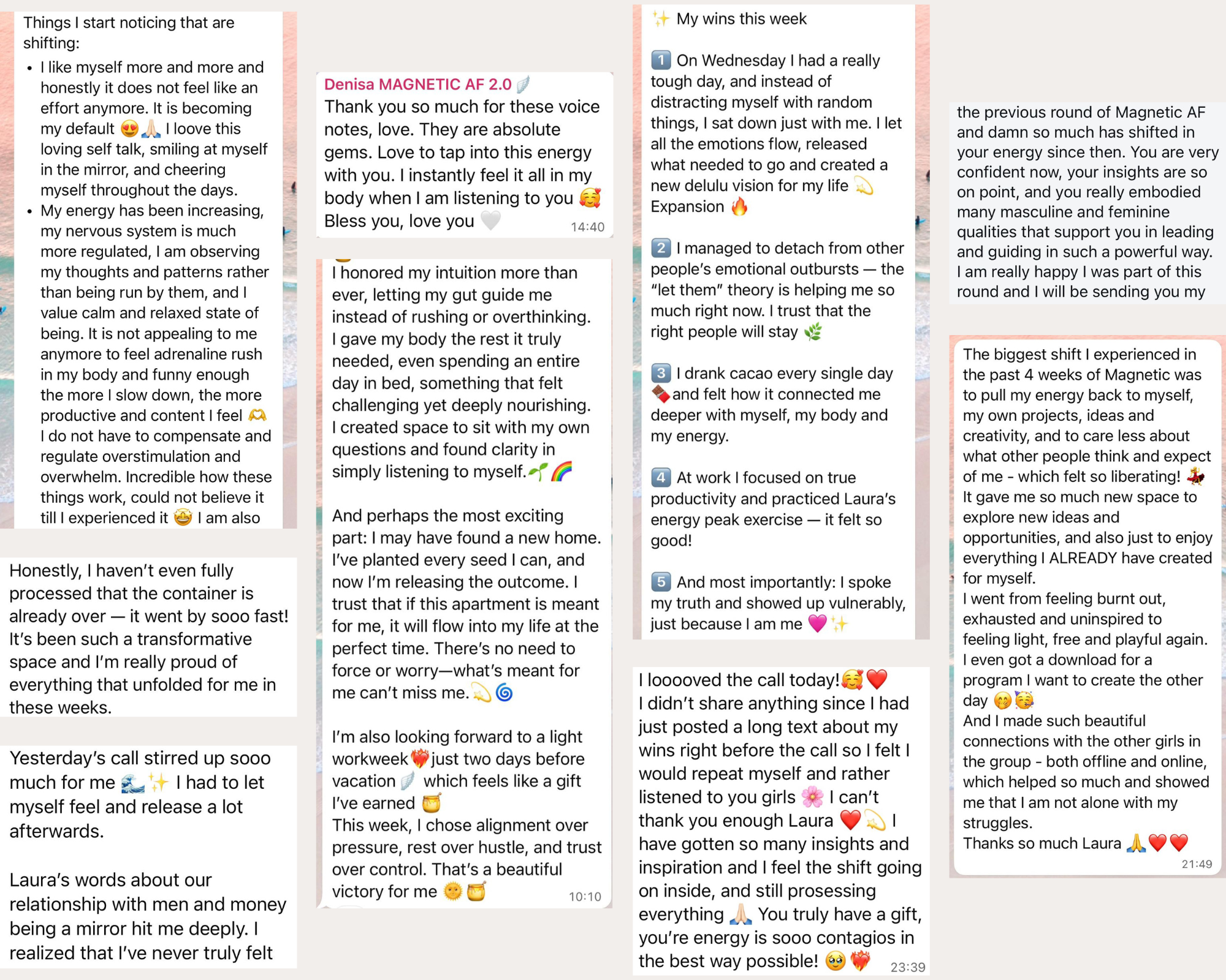 "Laura, thank you so much for Magnetic AF. I was really in a difficult life situation at the time and this course gave me so much energy and clarity. I asked myself so many helpful questions and learned a lot of new things about myself. I have learned to accept my feminine side and to find my way back to myself.